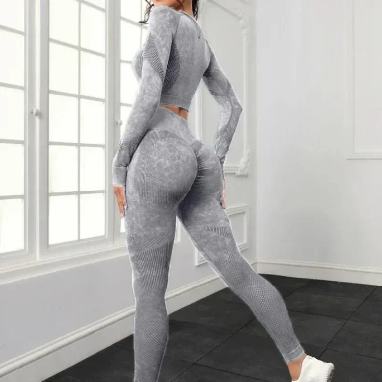 2 Piece Acid Wash Gym Set Women Seamless Long Sleeve Leggings Tracksuit Sports Fitness Suit Scrunch Workout Clothes Yoga Outfits