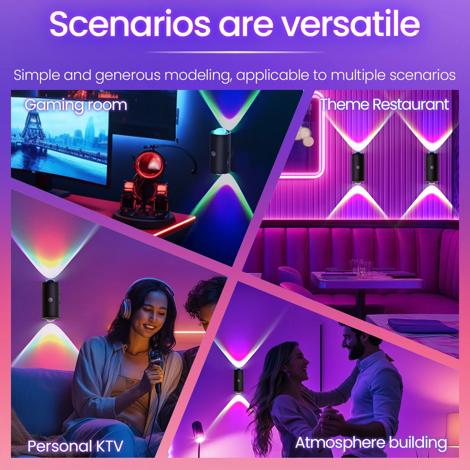 Sleek and minimalist black housing design perfect for modern home decor and space-saving installation.Simple button control interface allows quick switching between various lighting modes and colors.Features dual LED lights, produces both upward and downward light projection for enhanced room illumination and atmosphere.