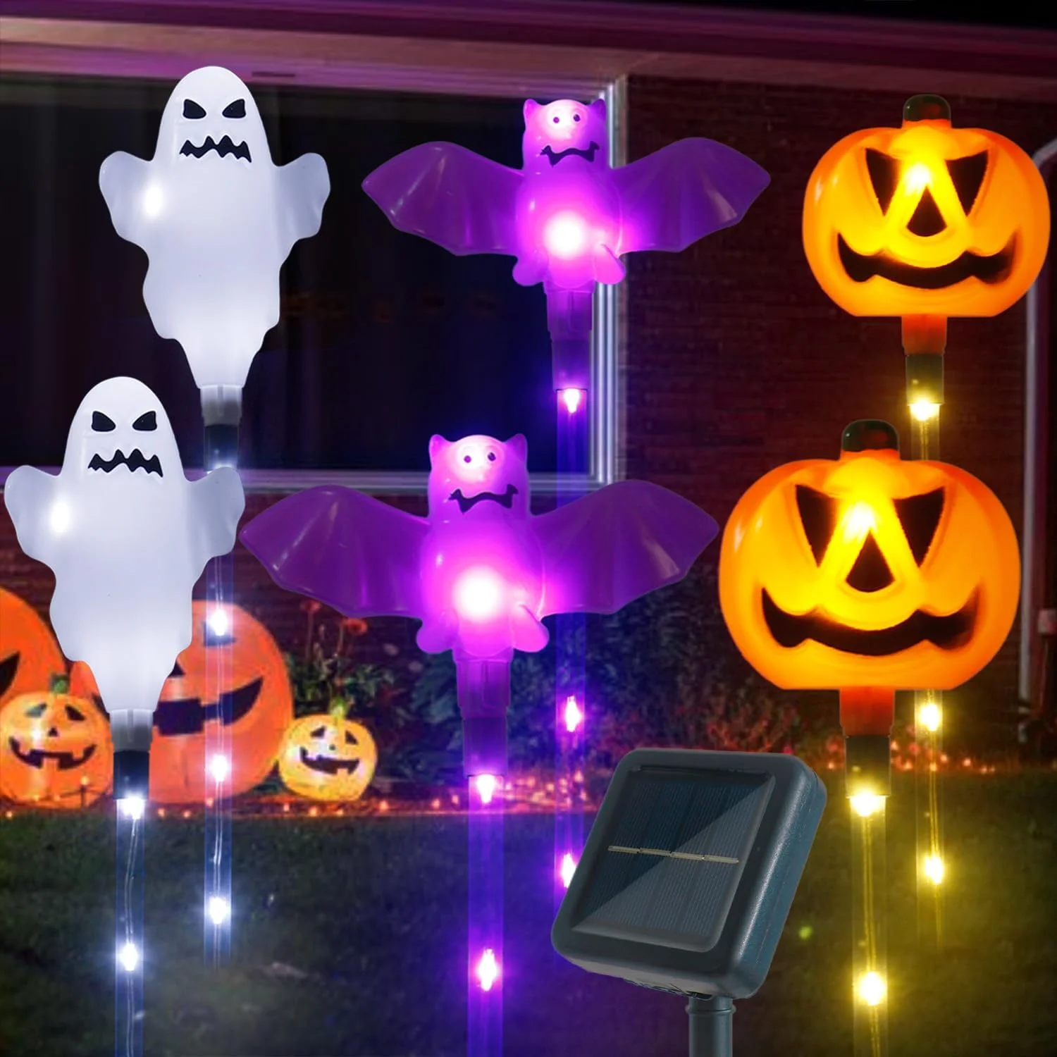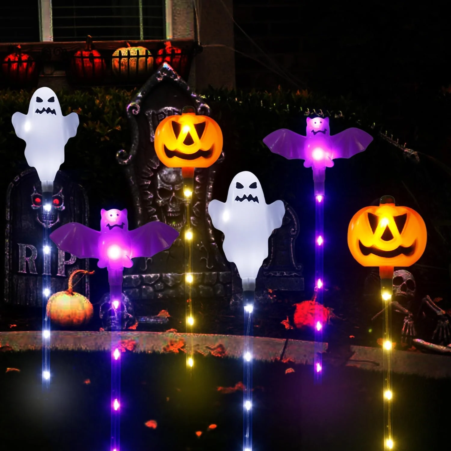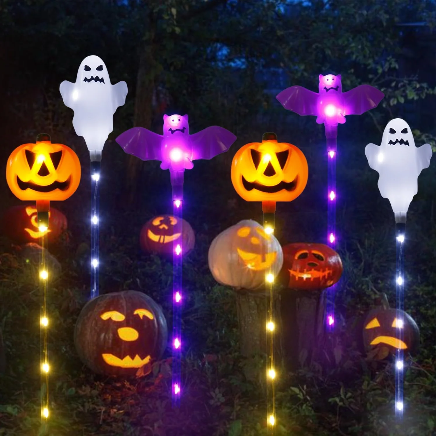 6pcs/Set Solar Powered 8 LED Pumpkin Bat Ghost Garden Stake Light Halloween Outdoor Landscape Lamp For Home Yard Halloween Decor