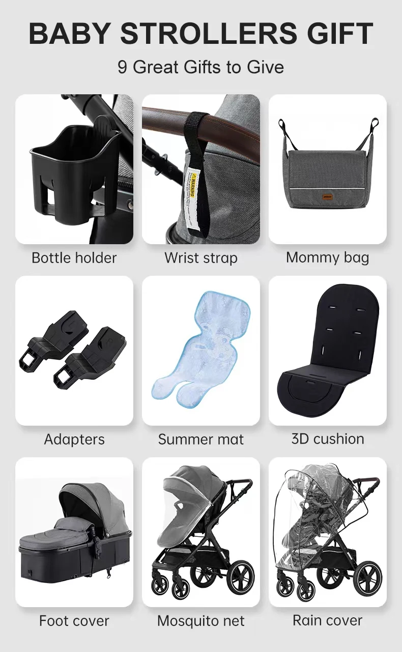 Stroller frame, 2 in 1 basket, baby safety seat, 4 wheels, armrest, basket adapter, foot cover, cup holder, cotton pad, Mummy Bag, Rain cover, Mosquito net, cooling mat.