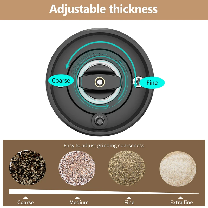 👍【Many Adjustable Coarseness】Turn the electric pepper grinder knob at the bottom of the device to adjust the coarseness you like. It can ground into fine particles by rotating clockwise, and coarse particles by rotating counterclockwise, suitable for sea salt, black pepper, gold pepper, white pepper and other solid spices.