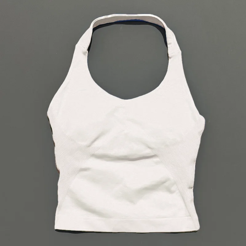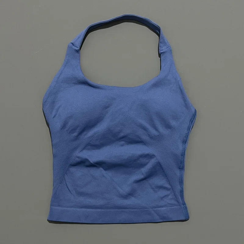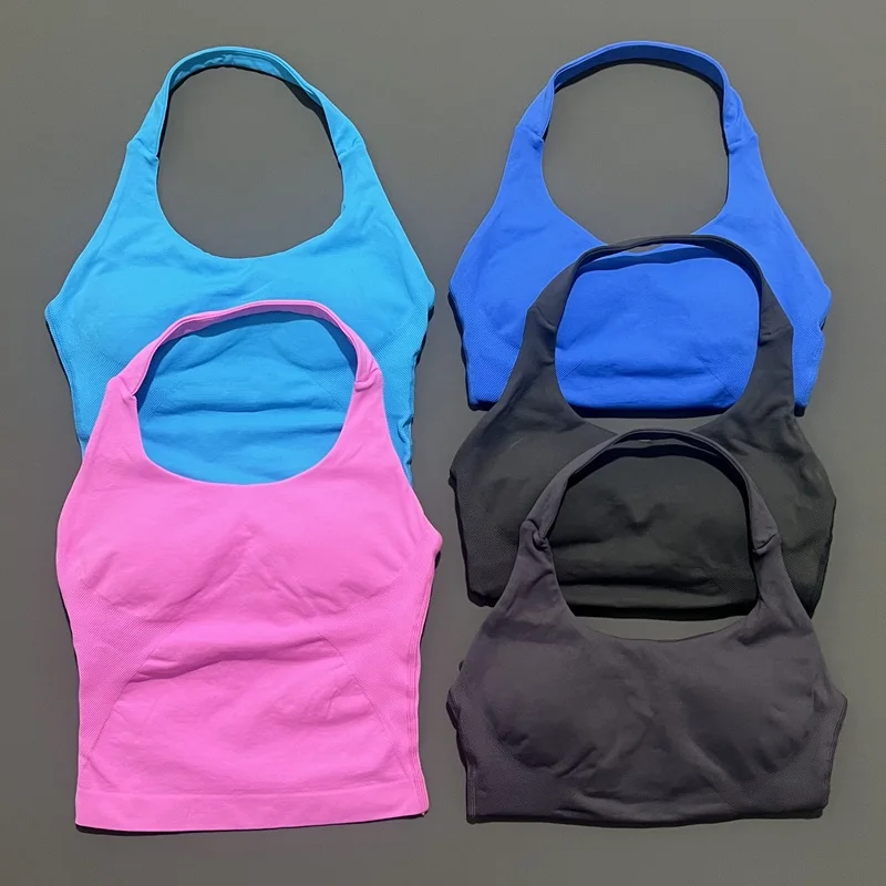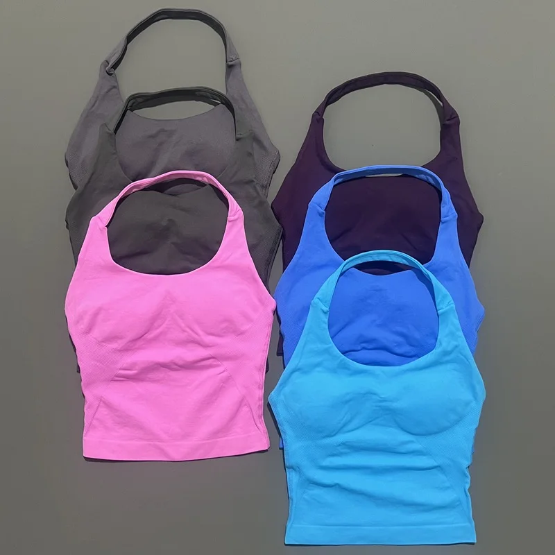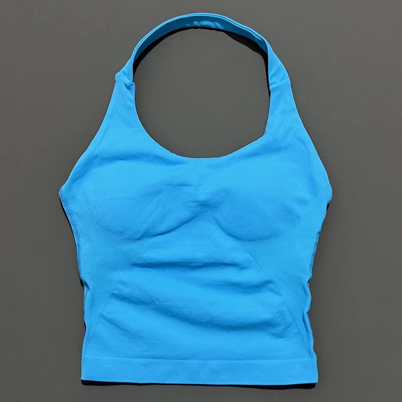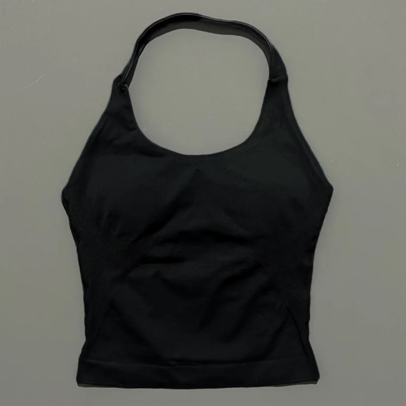 HISTELLO Impact Halter Top Seamless Longline Strappy Gym Top Women Built-in Bra Removable Cups Activewear Yoga Tank Tops