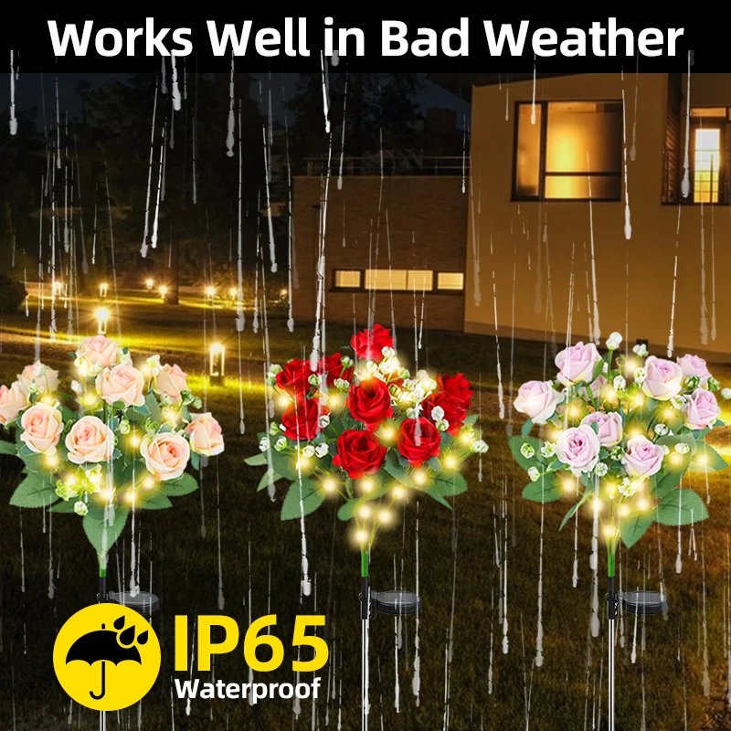 These solar yard lights don’t require tools or personnel assistance, nor does it require wires or external power. Simply connect the flower branches to the stake, then insert the solar flowers outdoor waterproof into the ground, turn on the button, and remove the film.