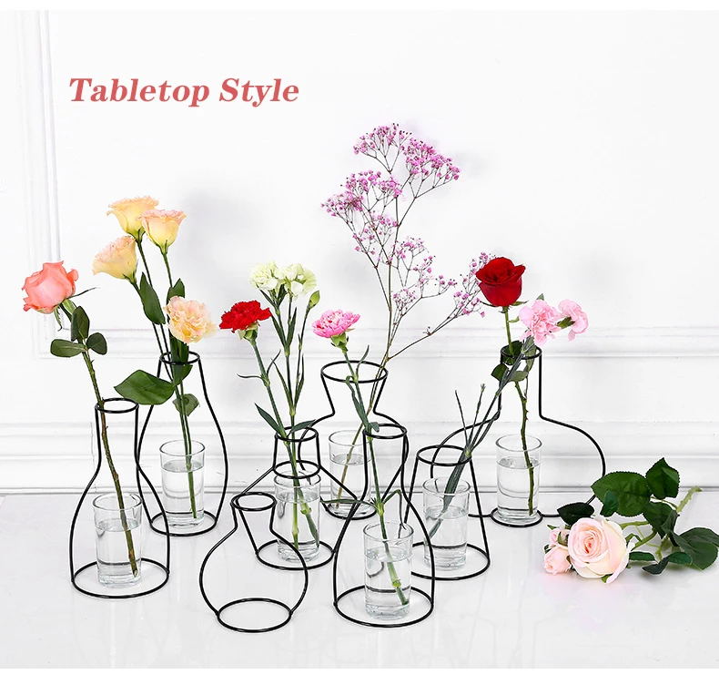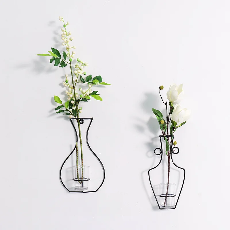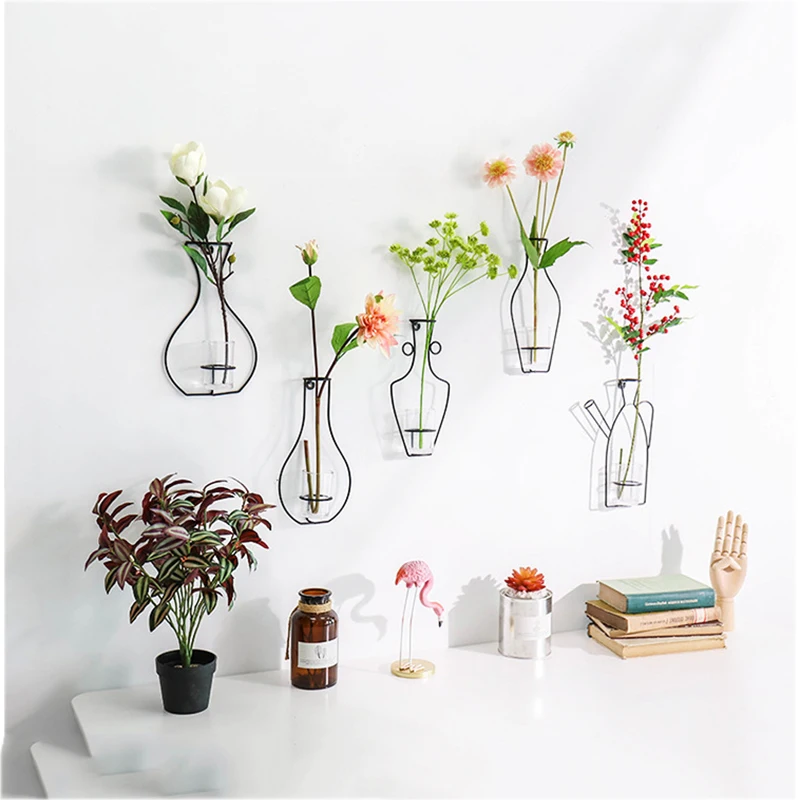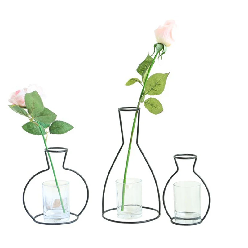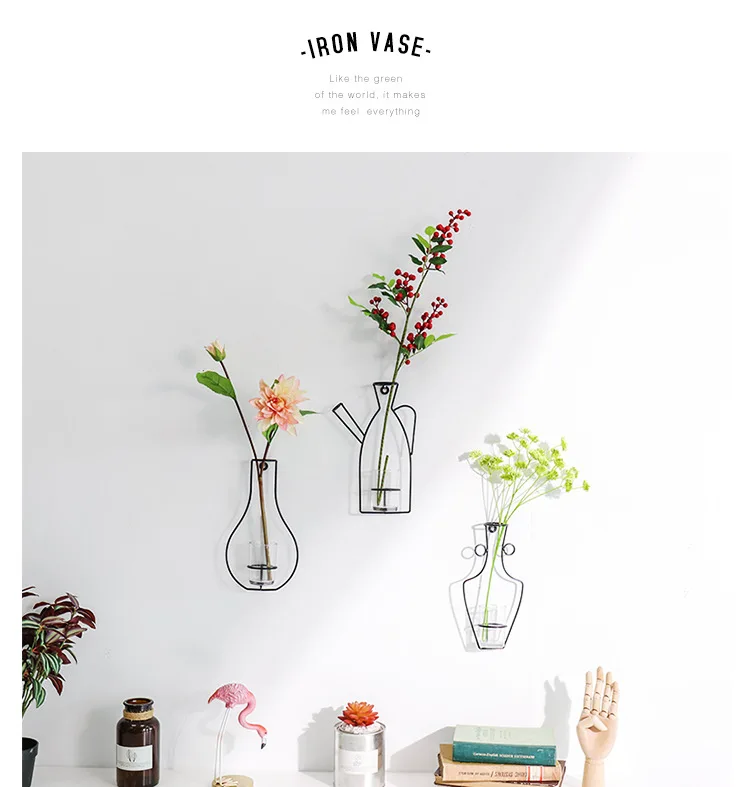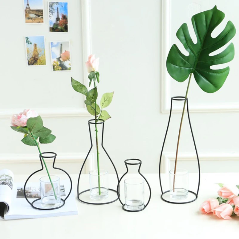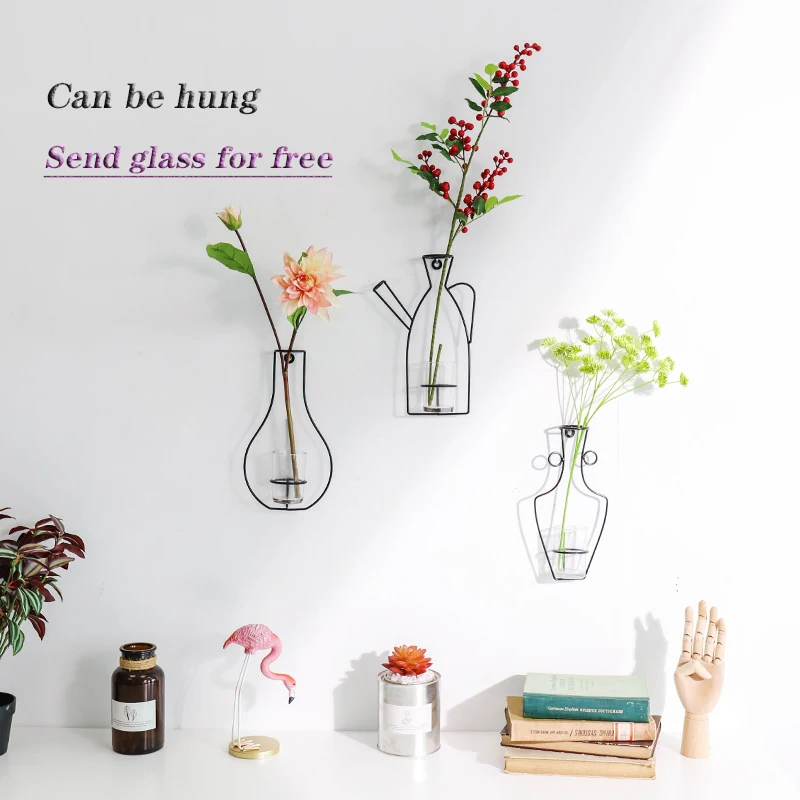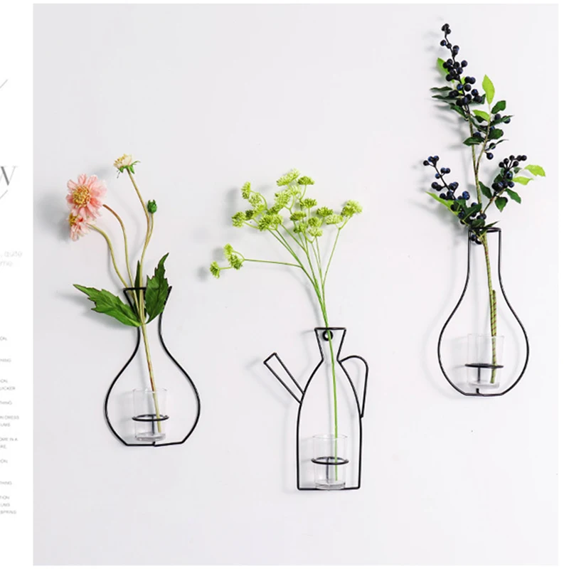 Retro Wrought Iron Hanging Vase Nordic Home Decoration Tabletop Plant Holder Dried Flower Vase Wall Decoration With Glass