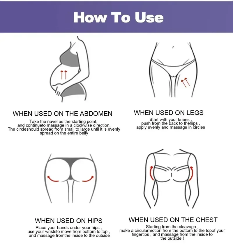 - Effects: Fade Stretch Marks,Enhance Skin Elasticity,Improve SkinTone,Firm Skin,Speed Up Healing