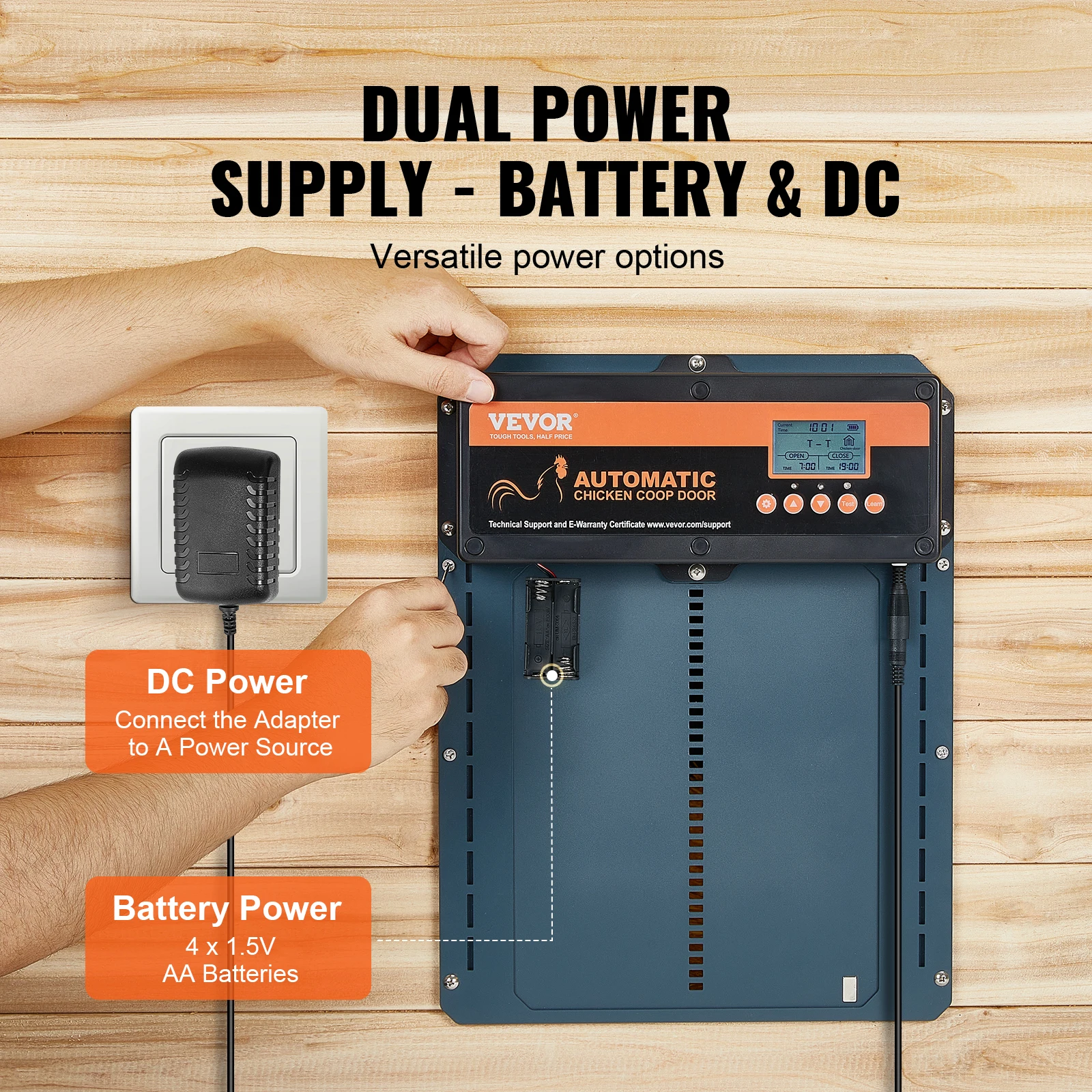 • Dual Power Supply:Designed for convenience, the door operates on both battery and DC power, so you don't need to worry about running out of power. This ensures uninterrupted operation and reliable access for your flock.
