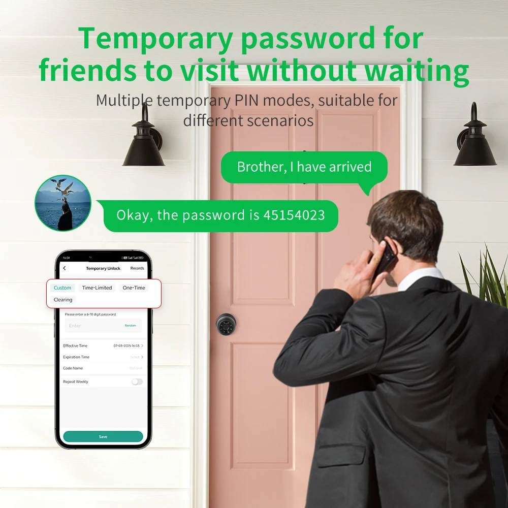 6.This device offers flexible and convenient temporary password functionality, supporting various modes such as one-time and time-limited access. It meets temporary access needs across different scenarios, including visits from friends and family or home service providers. Guests need not download any apps or endure lengthy waits; hosts can remotely share passwords to grant entry authorization. This approach ensures security while significantly enhancing daily convenience and reception efficiency.