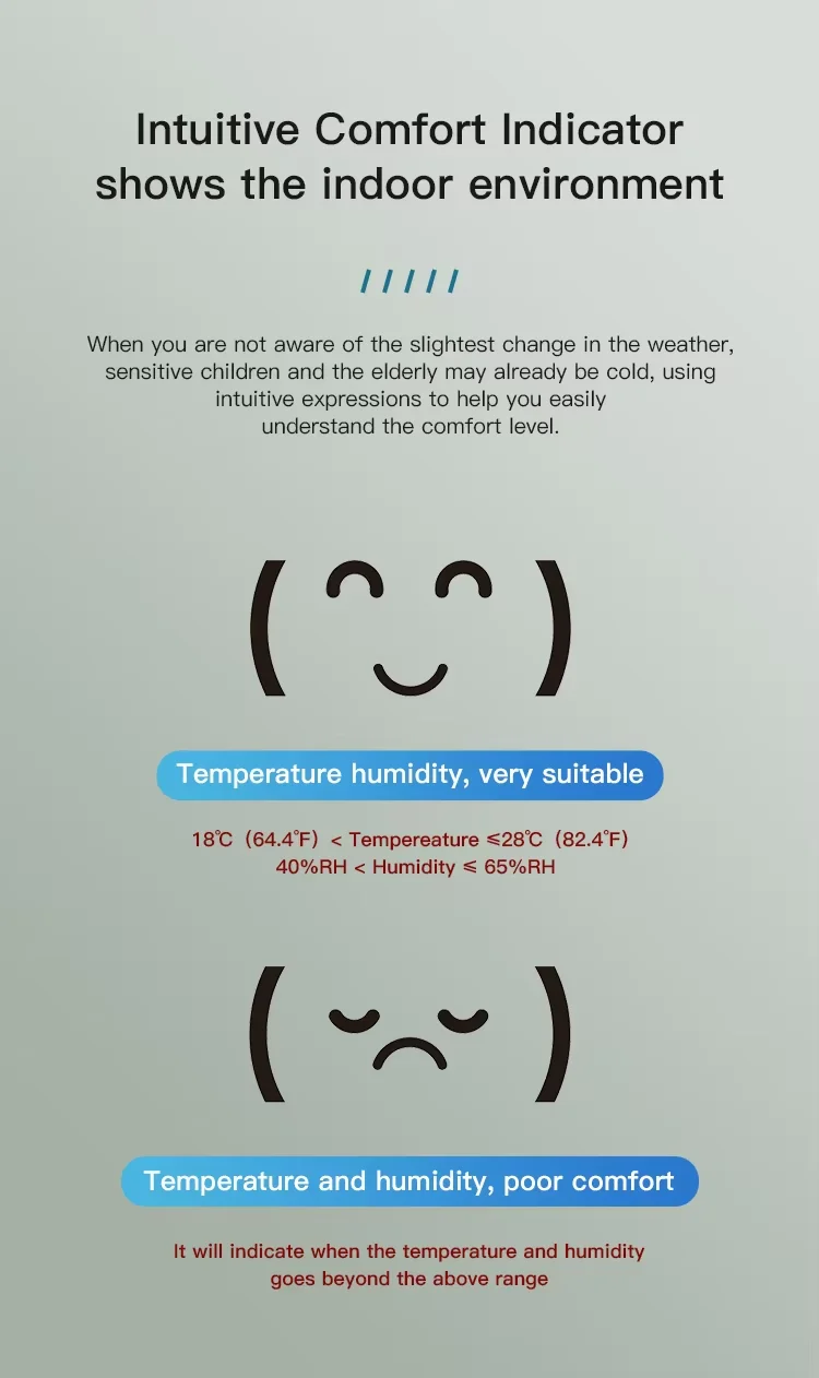 – Air omfort indicator: Level icons indicate air comfort, great for monitoring family's living conditions and health.
