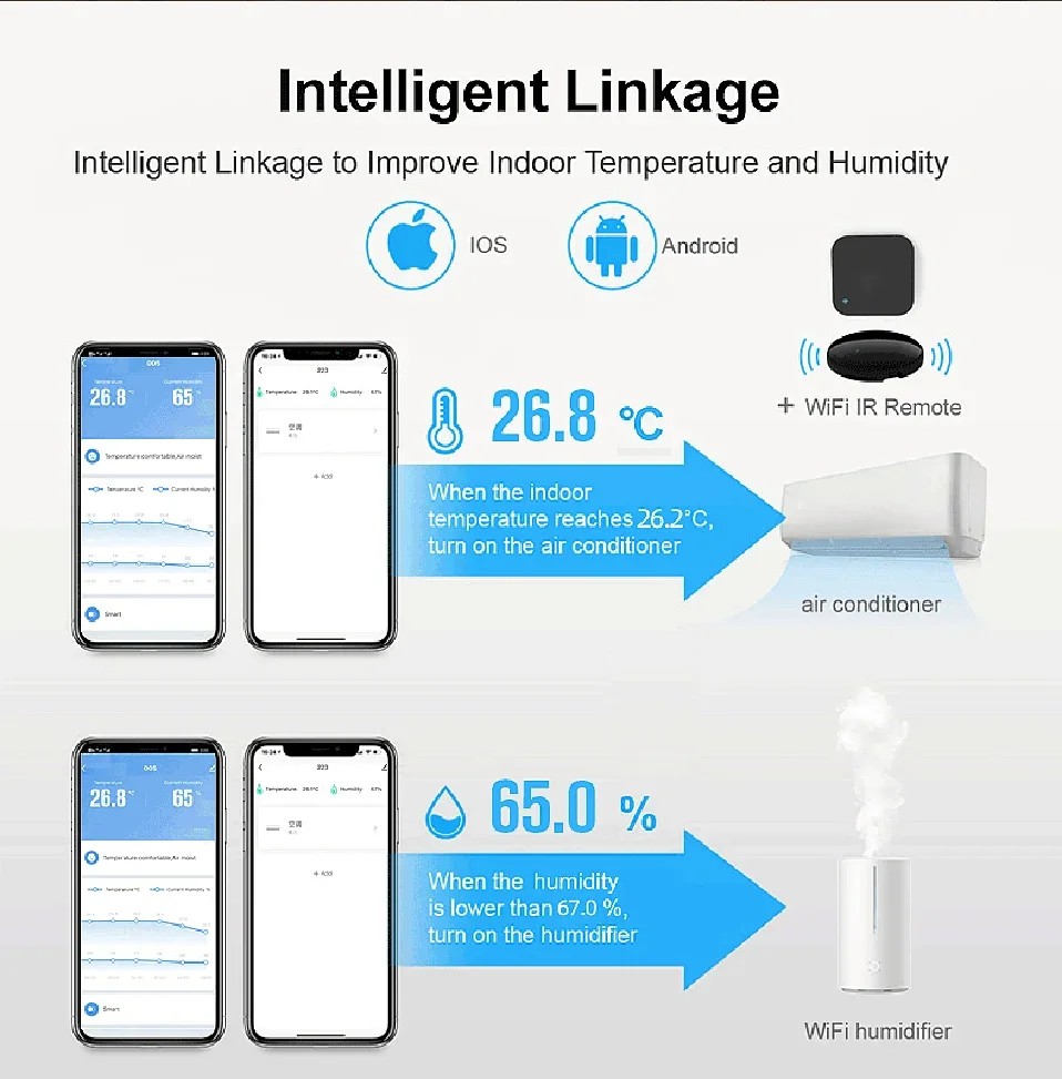 High-precision and real-time monitoring help you complete different linkage strategies. For example, if the temperature reaches 32.6 degrees Celsius, than turn on the air conditioner through our universal remote control. Or turn on the humidifier when the humidity is less than a certain value.
