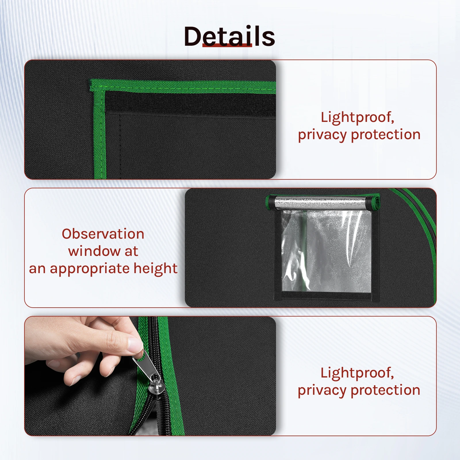 🌸All-round environmental control: the mini greenhouse is equipped with multiple adjustable vents and observation windows that regulate the ventilation and heat dissipation inside the tent. It allows easy integration of fans, lamps, cables and other devices to replicate the natural conditions and meet the growth requirements of plants