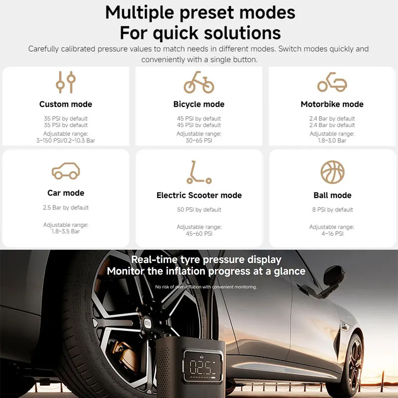 * Mijia Portable Electric Air Compressor is accurate to ±2psi in tire pressure detection; the accuracy of Xiaomi Mijia Portable Electric Air Compressor 2/2D has been upgraded to ±1psi.